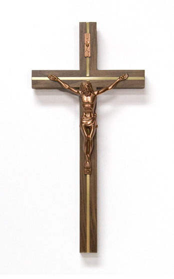 10˝ walnut crucifix with brass inlay, copper traditional corpus and bronze long style INRI. Product is made in the U.S.A.